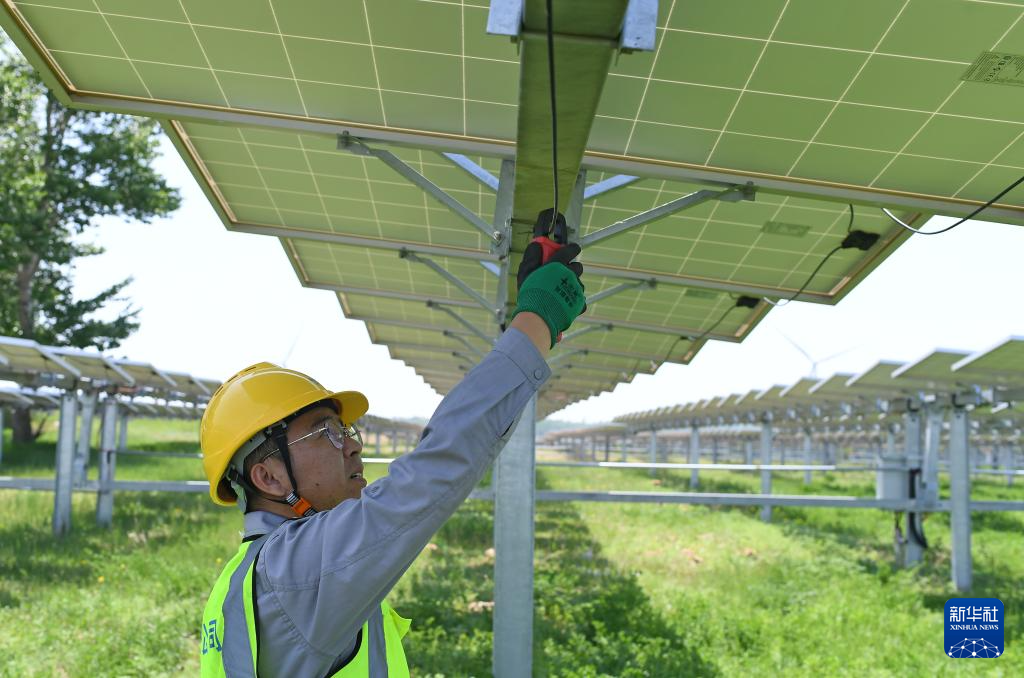 6月11日,在德胜村一光伏电站,一名电力工作人员对光伏组件进行故障排查。目前,德胜村建成一座由国家电投负责运维的50兆瓦光伏电站和一座500千瓦的村级光伏电站,实现集体经济年稳定增收60余万元。