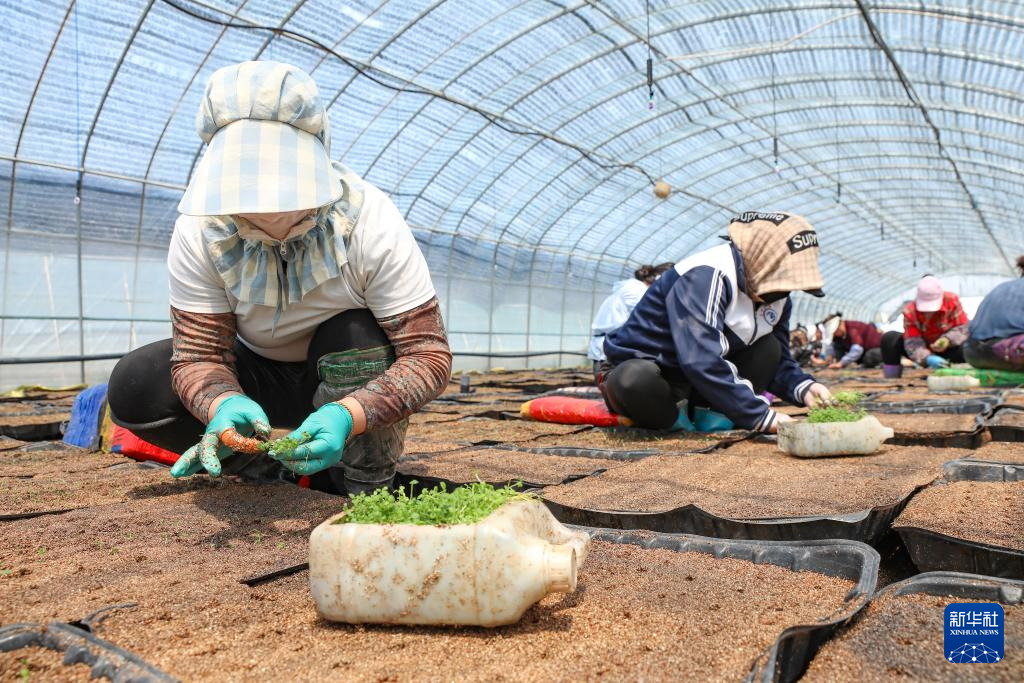 6月11日,德胜村村民在大棚内栽种马铃薯幼苗。目前,德胜村已建成300亩马铃薯微型薯育种园区和加工园区,建设育种大棚287个,每年可为村集体创收100余万元。