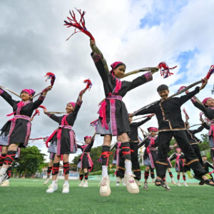 6月11日,五指山市红星学校学生在练习苗族盘皇舞。