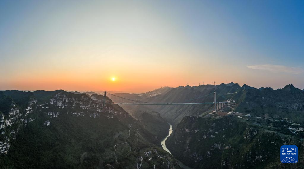夕阳下的贵州花江峡谷大桥(6月11日摄,无人机全景照片)。
