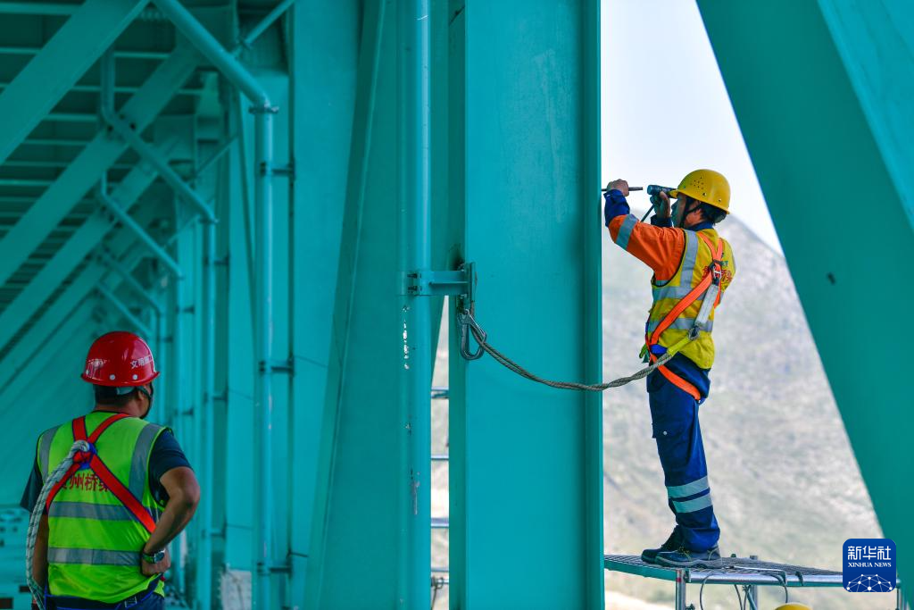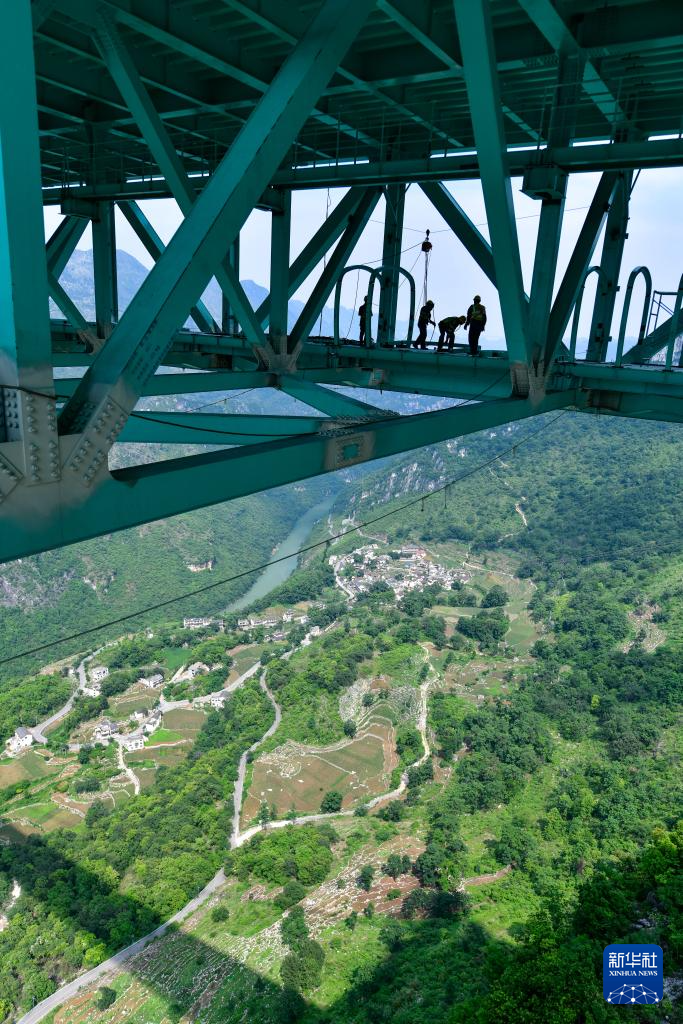 6月11日,建设者在贵州花江峡谷大桥上安装竞速跑道安全绳轨道。