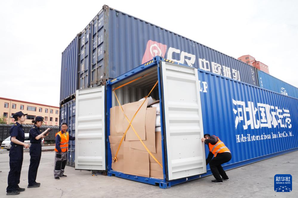 6月14日,中国海关工作人员在二连浩特站机械换装区查验货物。