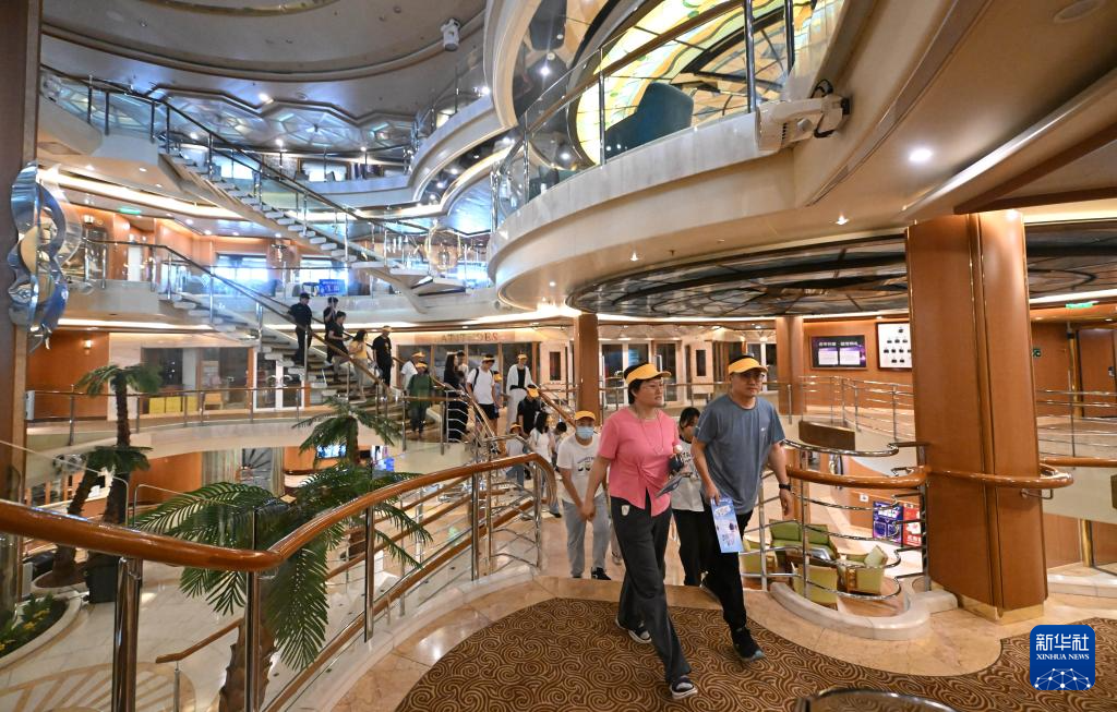 6月14日,游客在东方邮轮“梦想”号内参观。