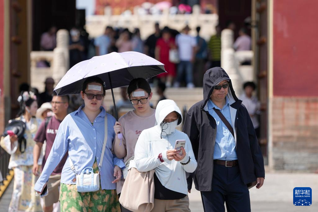 6月10日,在北京天坛公园,贴消暑贴的游客撑伞游览。