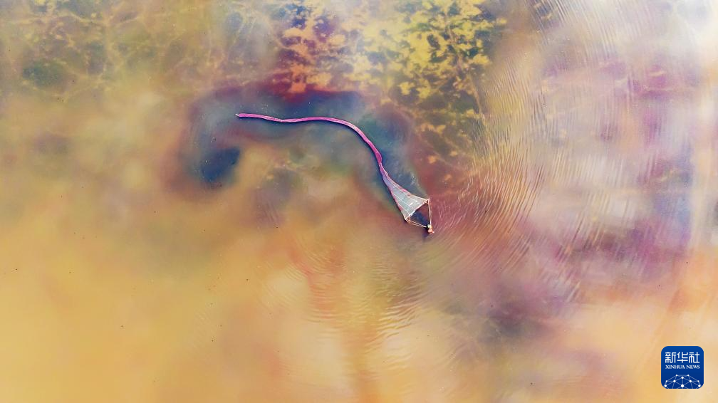 6月8日,捕捞人员在山西省运城市盐湖内进行捕捞盐水虫作业(无人机照片)。