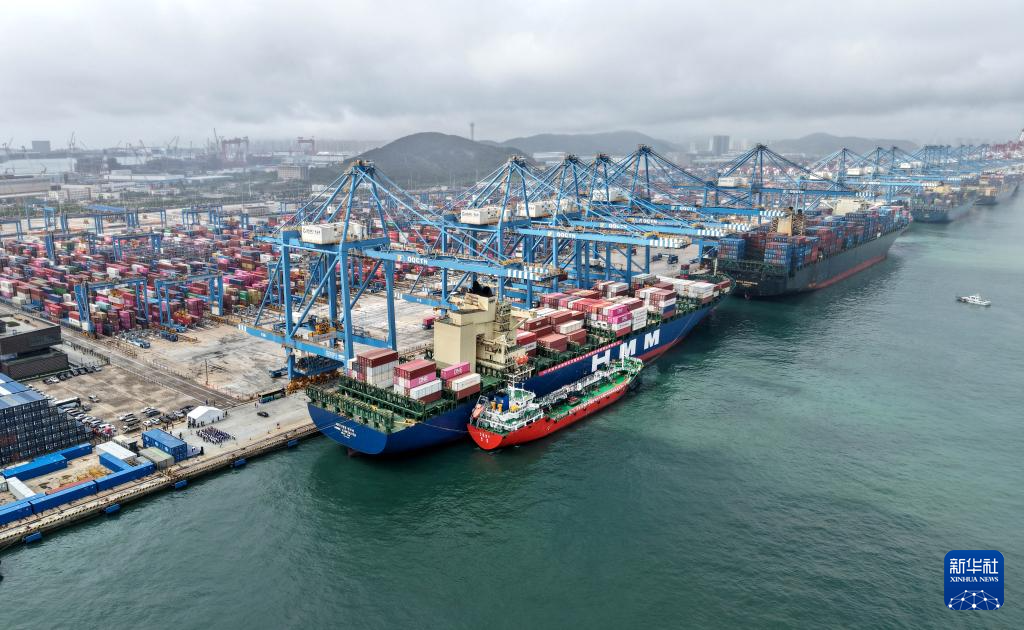 6月14日,山东港口青岛港前湾港区109泊位,“大源油8”轮(前右)在为“现代温哥华”轮加注燃料油(无人机照片)。