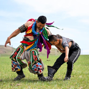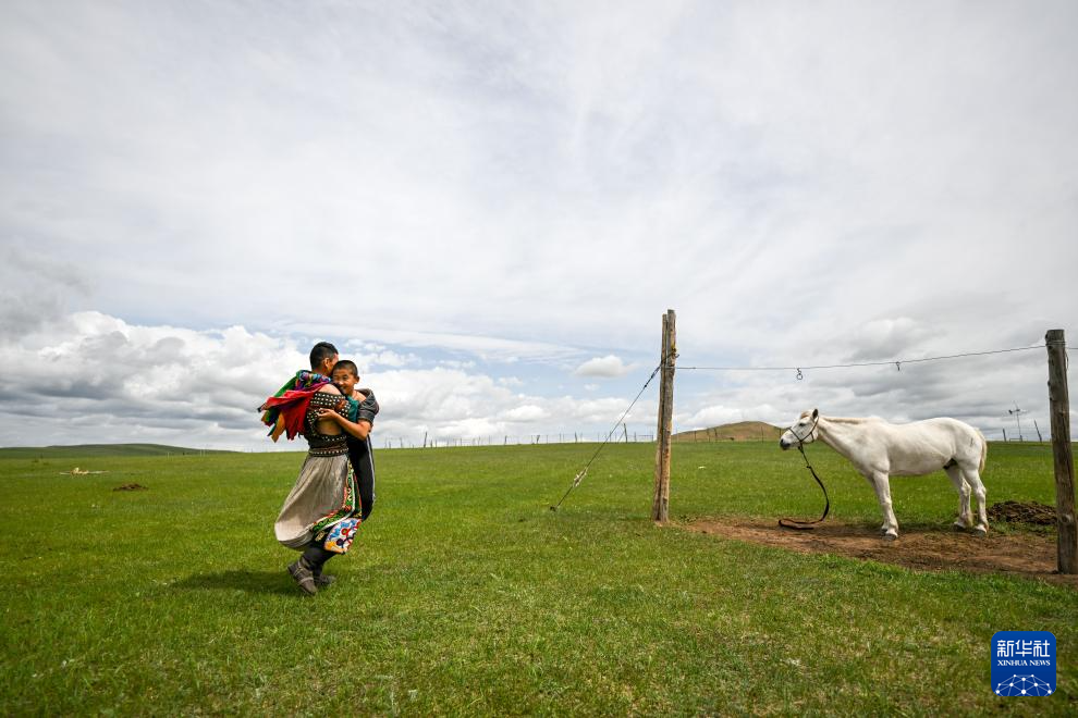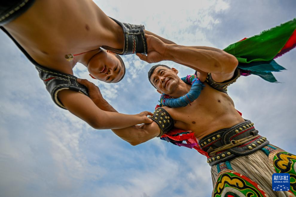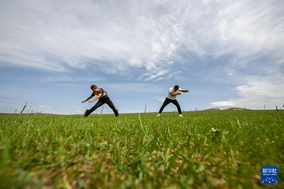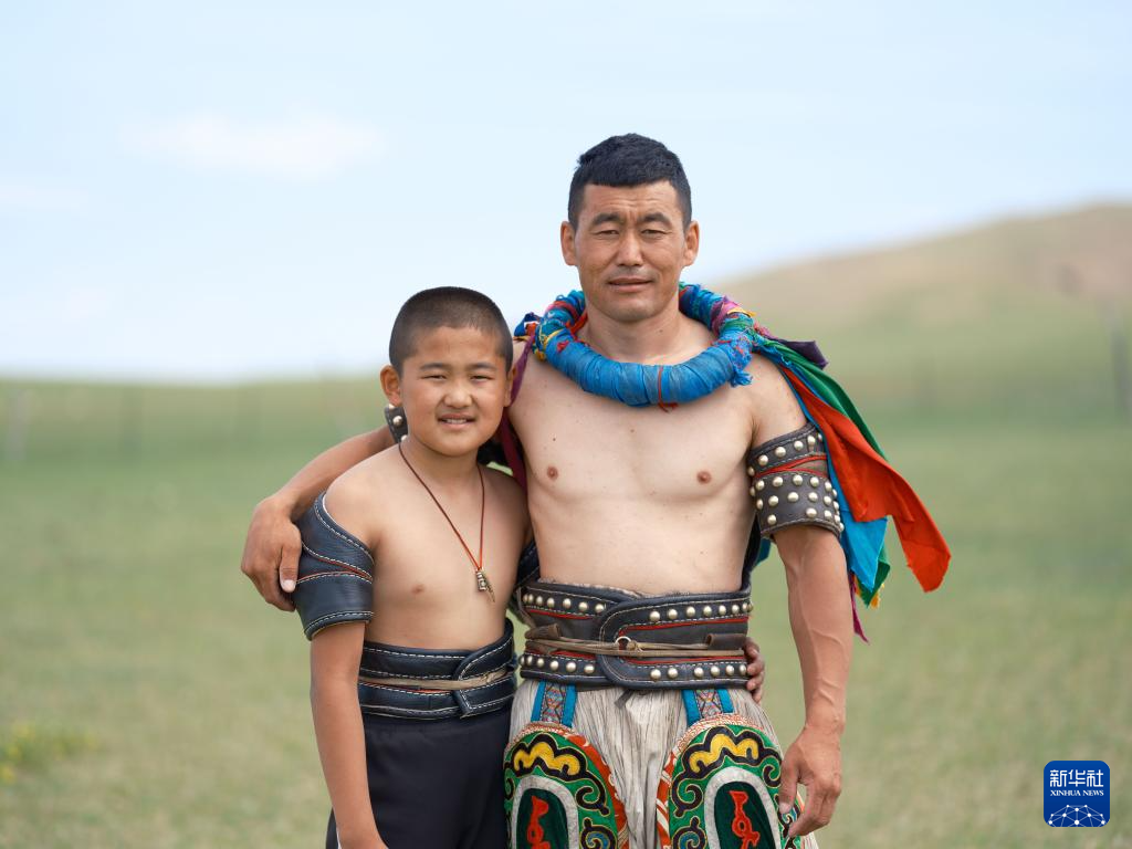 蓝天白云,绿草如茵。夏日的锡林郭勒大草原风景如画,37岁的牧民敖日布桑和他12岁的儿子德格金在这片理想的搏克场地上摩拳擦掌,准备相互角力。