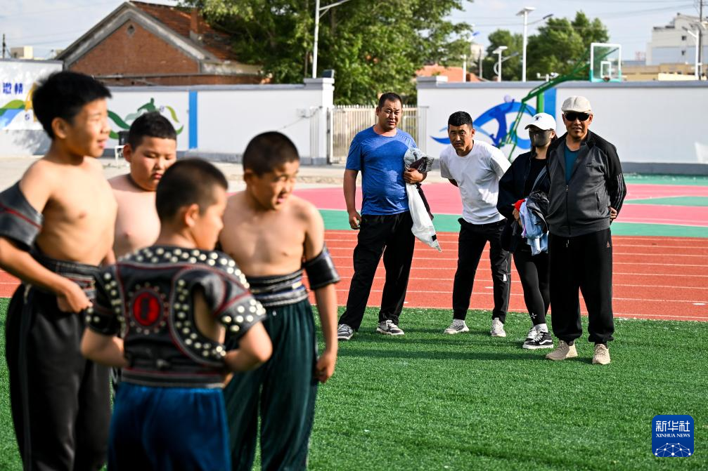6月12日,在西乌珠穆沁旗第一小学,敖日布桑(右三)陪着儿子德格金(右五)参加搏克手选拔赛。
