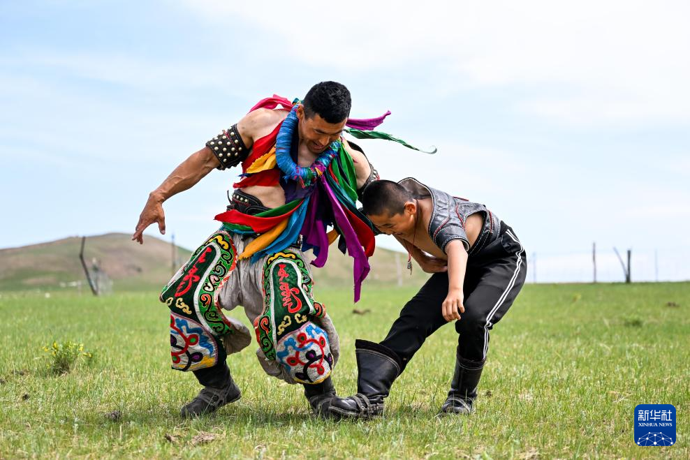 6月12日,敖日布桑与儿子德格金在草原上练习搏克。