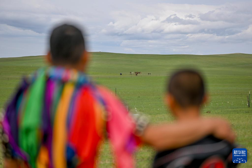 6月12日,敖日布桑与儿子德格金在训练间隙望向远处的马群。