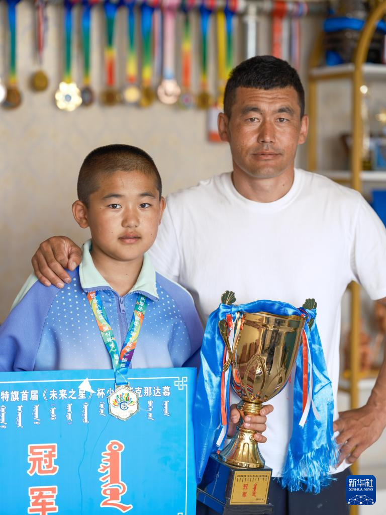 6月12日,德格金与父亲敖日布桑在家中展示参加搏克比赛获得的奖项。