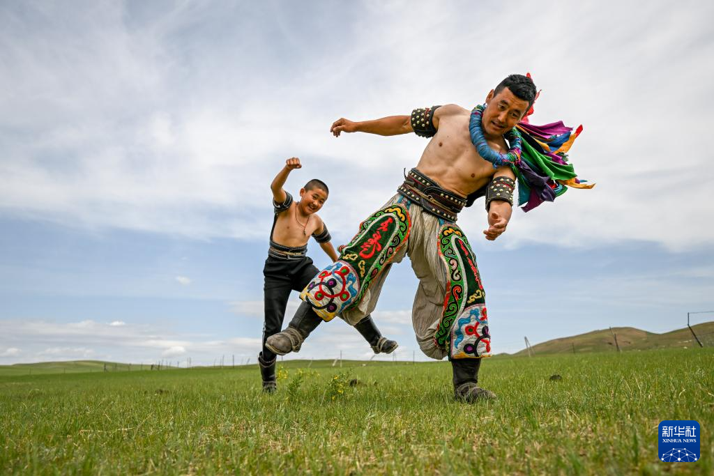 6月12日,敖日布桑与儿子德格金练习搏克手入场时的鹰步。