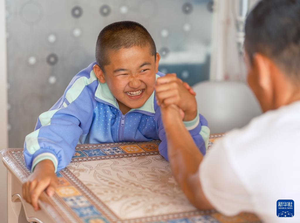 6月12日,德格金与父亲敖日布桑在家中掰手腕。