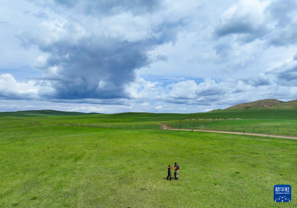 6月12日,敖日布桑与儿子德格金在草原上练习搏克(无人机照片)。
