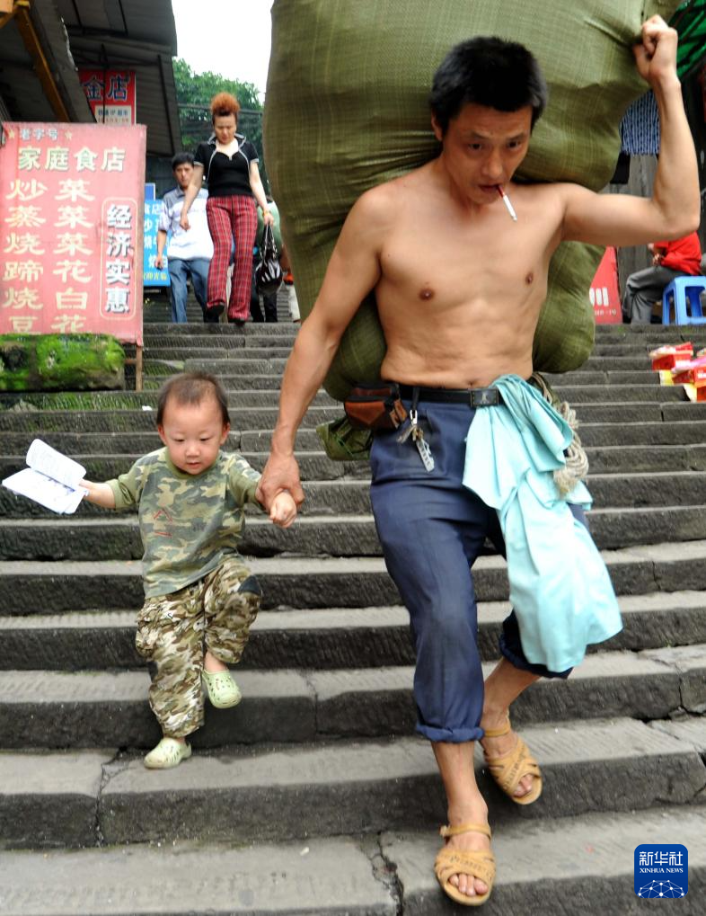 2010年父亲节,在重庆朝天门批发市场的人潮中,“棒棒”冉光辉肩扛货物稳步前行,粗糙的大手紧紧攥着年幼的儿子——肩上压着生计,手里牵着希望,这一瞬间被摄影师定格。