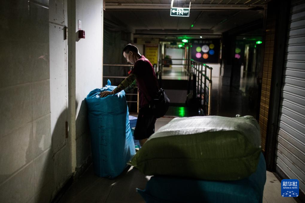 冉光辉在堆积如山的货物里寻找自己要搬运的货物(2013年5月24日摄)。