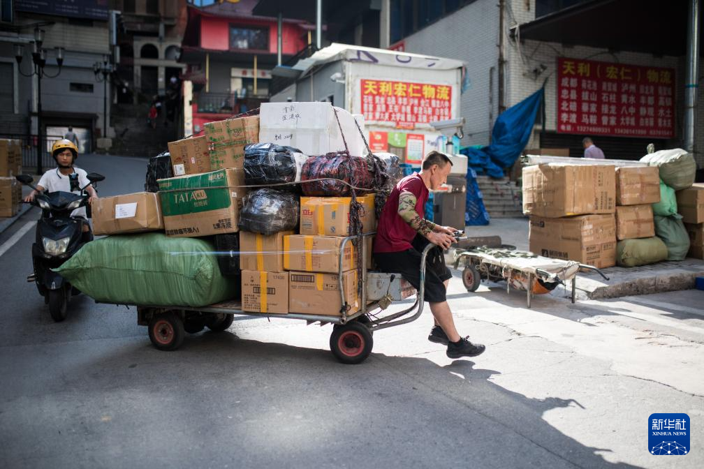 在重庆朝天门批发市场,冉光辉拉着一大车货物前去发货(2023年7月22日摄)。