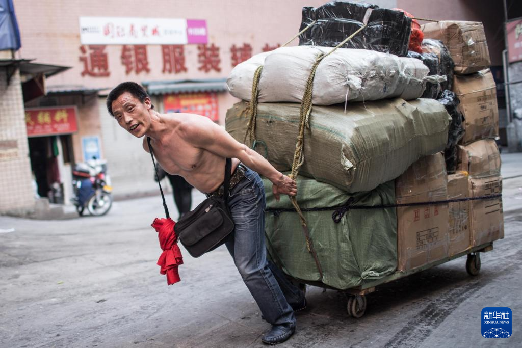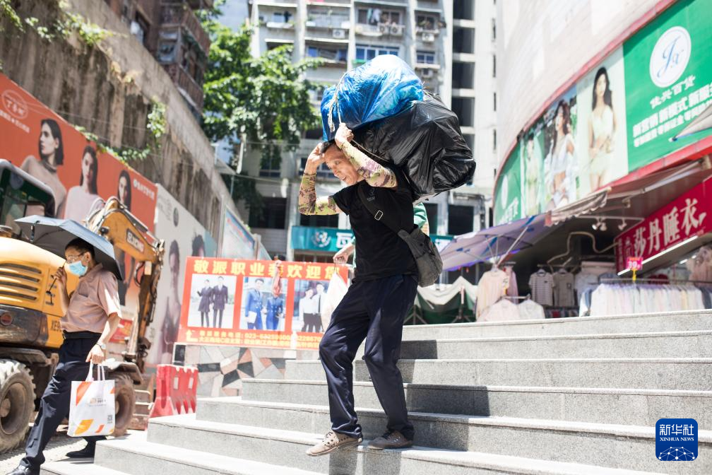 冉光辉在重庆朝天门批发市场搬运货物(2025年6月13日摄)。
