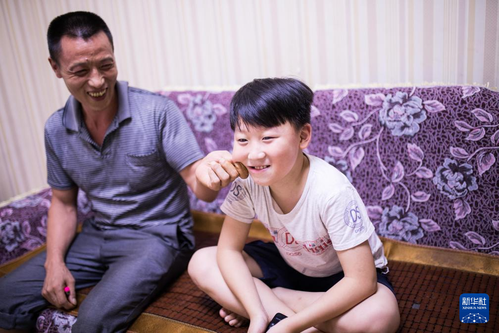 冉光辉在家中向儿子冉俊超了解学习情况(2020年6月9日摄)。