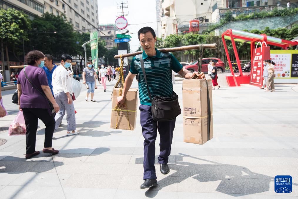 冉光辉挑着扁担运送货物(2020年6月10日摄)。