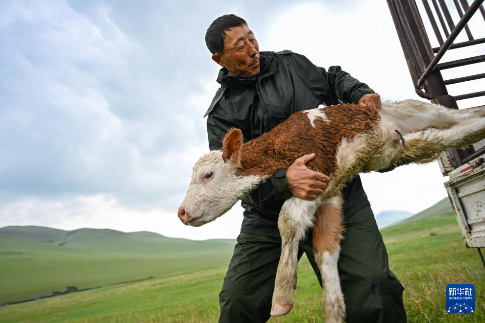 到达夏营地后,彩恩朝格图将初生的牛犊抱下卡车(6月15日摄)。