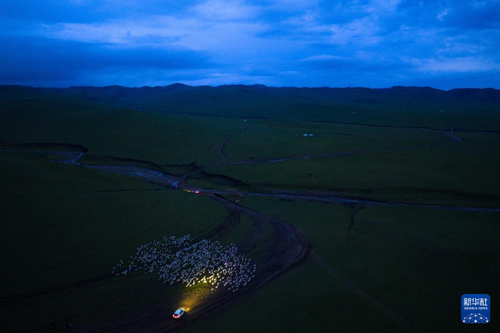 6月14日,牧民在草原上驱赶羊群赶夜路(无人机照片)。