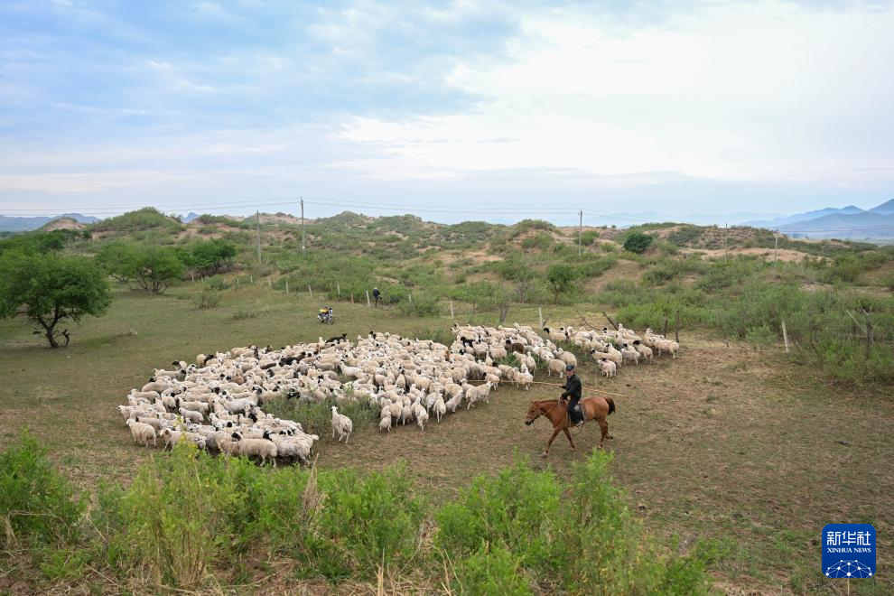6月14日,彩恩朝格图的儿子敖日格乐(左)骑摩托车赶羊(无人机照片)。