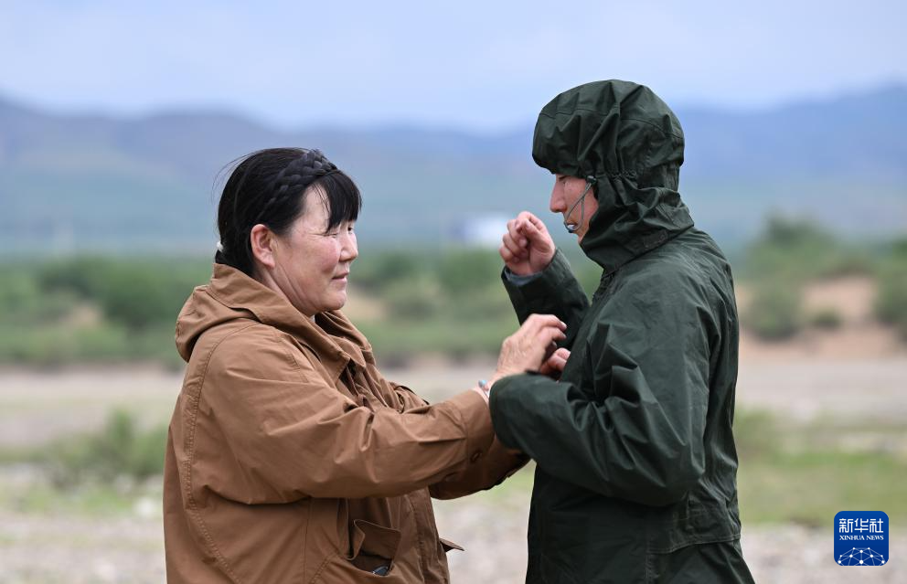 彩恩朝格图的妻子娜布其(左)为儿子敖日格乐穿雨衣(6月13日摄)。