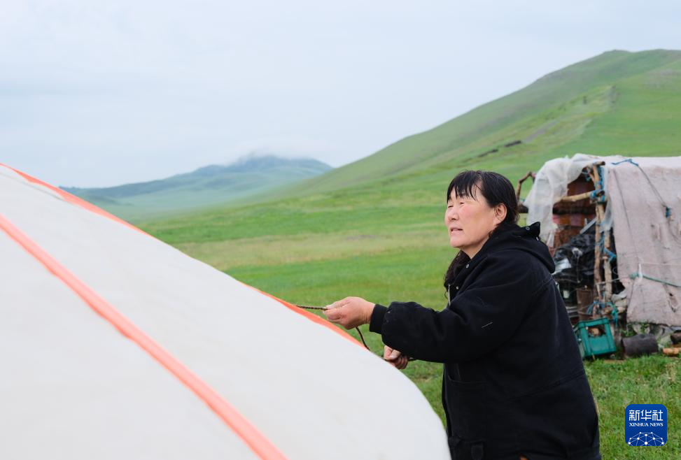6月15日,彩恩朝格图的妻子娜布其在整理蒙古包。