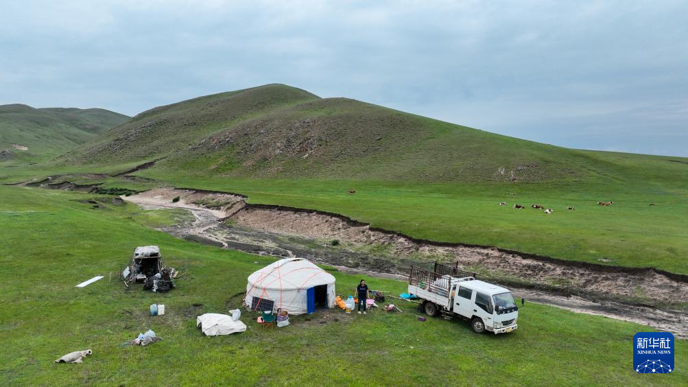 天未亮,一家人已开始准备。彩恩朝格图骑马聚拢散落的牛羊,妻子娜布其将物资装车,儿子敖日格乐则用无人机查看是否有落单的牲畜。“夏营地休息了大半年,该让它‘上班’了。”彩恩朝格图解释着。牧民们清楚,只有轮换放牧,被啃食的草地才能喘息重生。