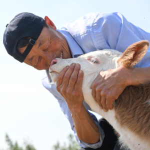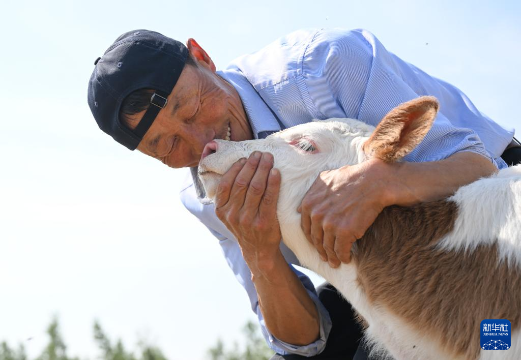 彩恩朝格图用鼻子触碰一头初生的牛犊(6月14日摄)。