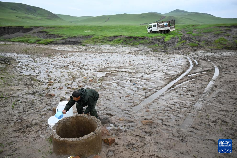 彩恩朝格图前往夏营地的一处泉眼打水(6月15日摄)。
