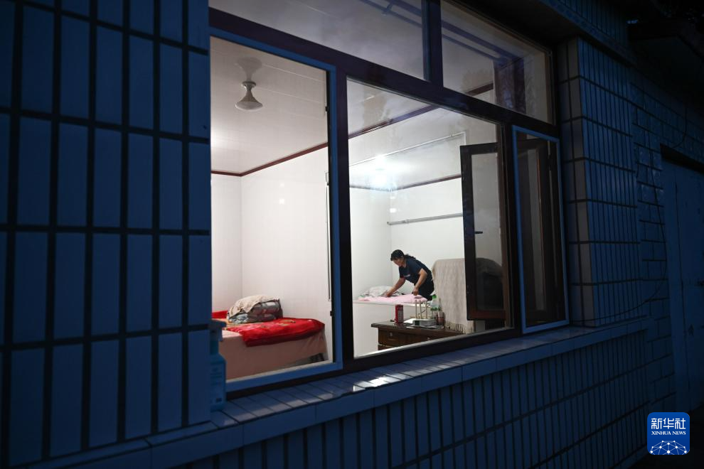 出发前,彩恩朝格图的妻子娜布其在家中收拾被褥(6月13日摄)。