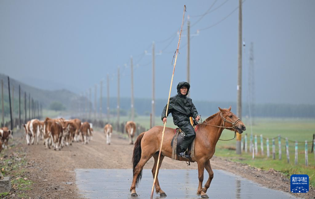 彩恩朝格图在雨中赶牛(6月13日摄)。