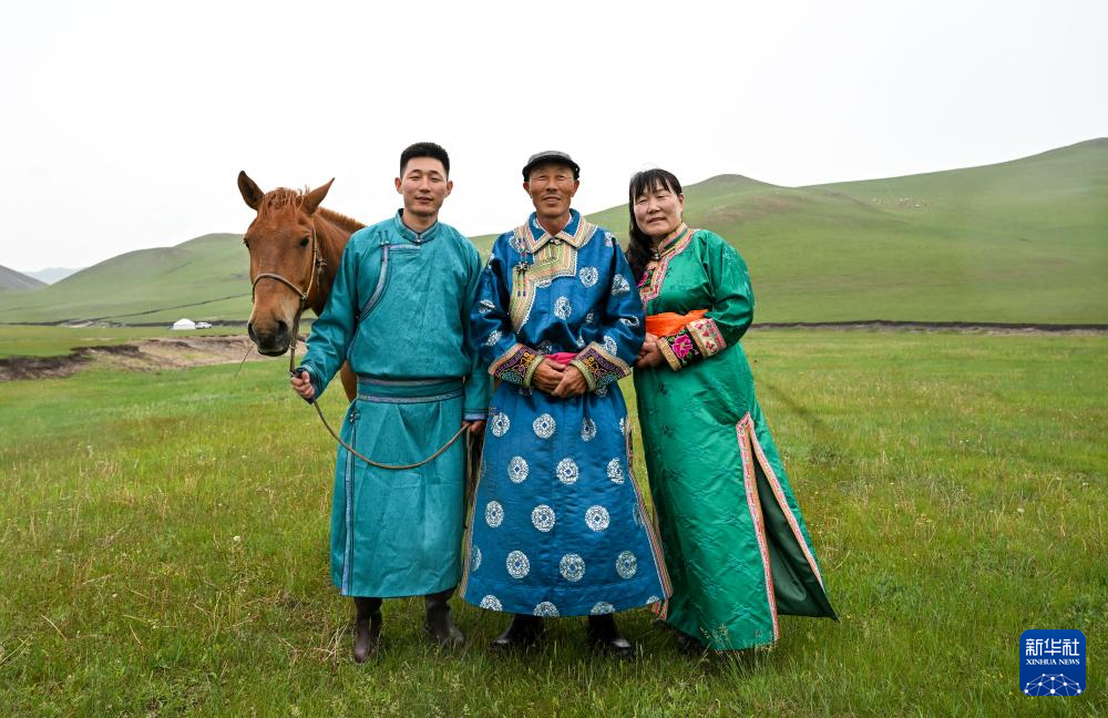 彩恩朝格图(中)和妻子娜布其(右)、儿子敖日格乐在夏营地合影(6月15日摄)。