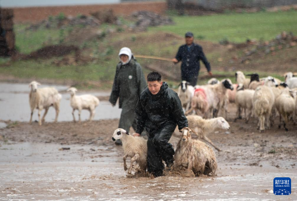 彩恩朝格图的儿子敖日格乐(右二)在雨中赶羊(6月13日摄)。