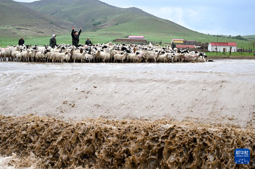 6月13日,彩恩朝格图的儿子敖日格乐拎着两只羊涉水。