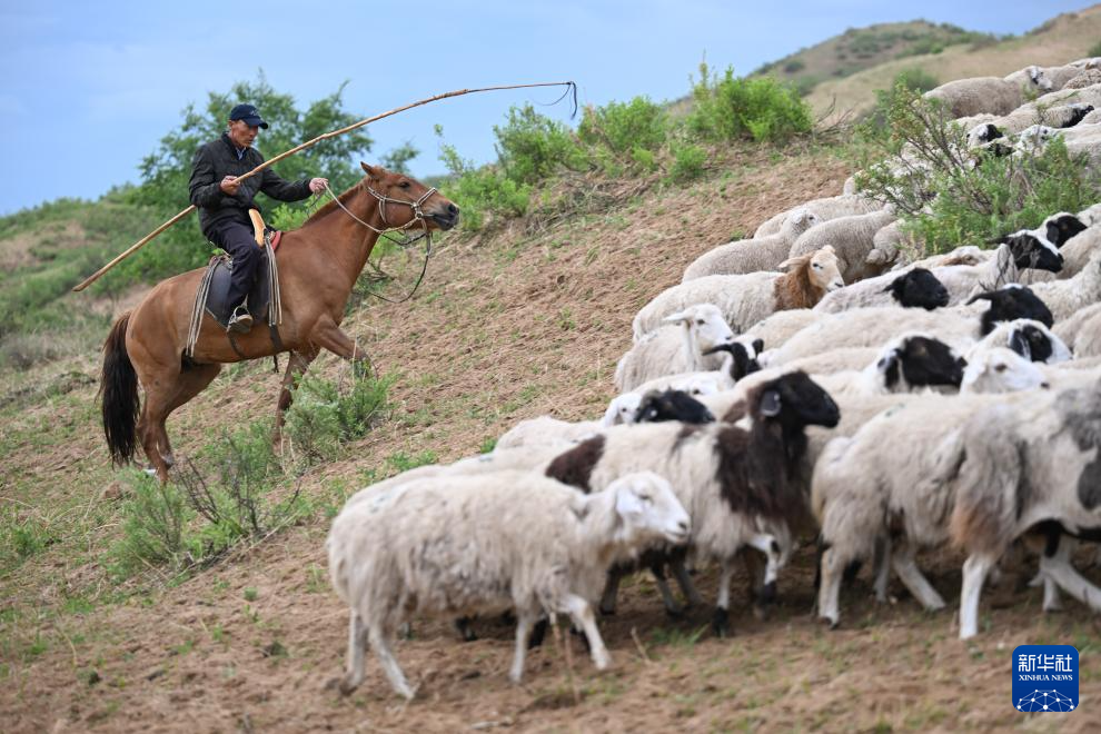 彩恩朝格图在冬营地将羊群聚拢,准备出发(6月13日摄)。