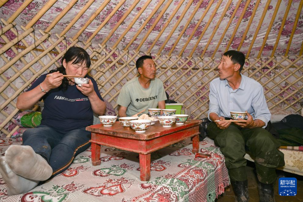 6月14日,彩恩朝格图(右)和侄子敖特根巴亚尔(中)、妻子娜布其在借宿的蒙古包中吃饭。
