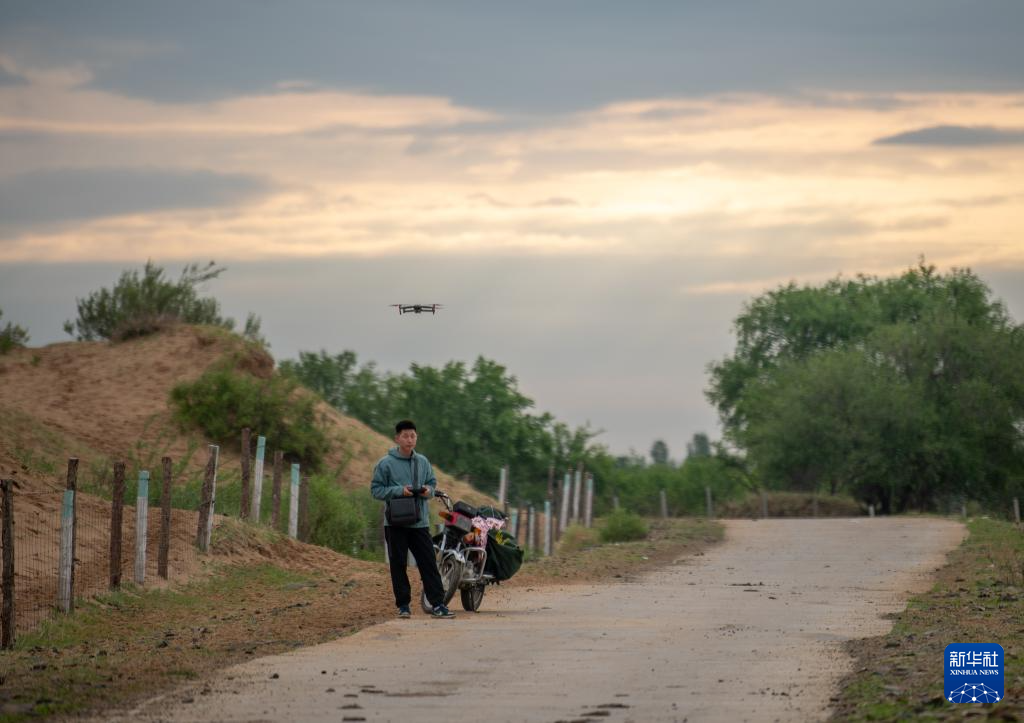6月13日,彩恩朝格图的儿子敖日格乐操作无人机检查牲畜数量。