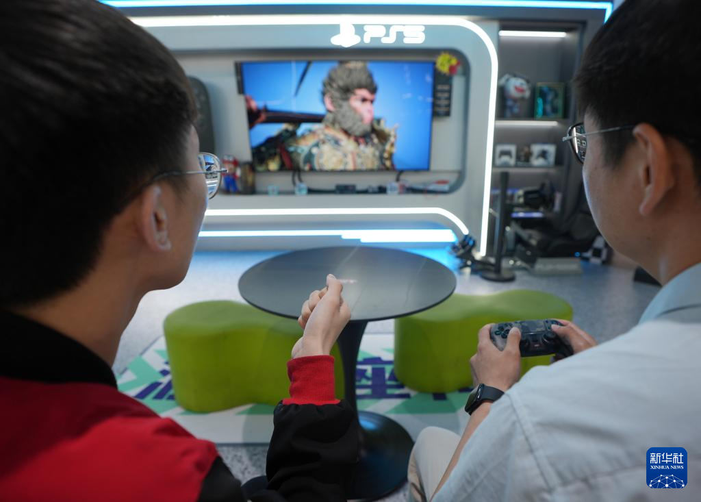 大连天津街京东MALL商场的游戏体验官(左)陪着顾客操控游戏角色(6月13日摄)。