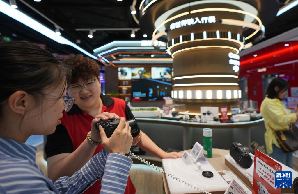 大连天津街京东MALL商场的摄影摄像销售专员姜小姐(左二)向顾客推荐照相机(6月13日摄)。