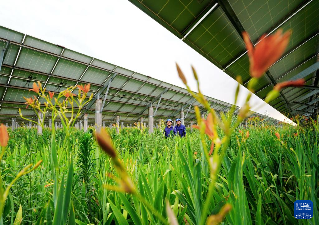 6月16日拍摄的河北省赞皇县许亭镇北潘村附近的“农光互补”光伏发电场(无人机照片)。