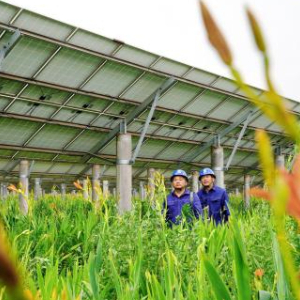 6月15日,国网巨鹿县供电公司的工人在辖区阎疃镇附近的“农光互补”光伏发电场巡检并网线路。