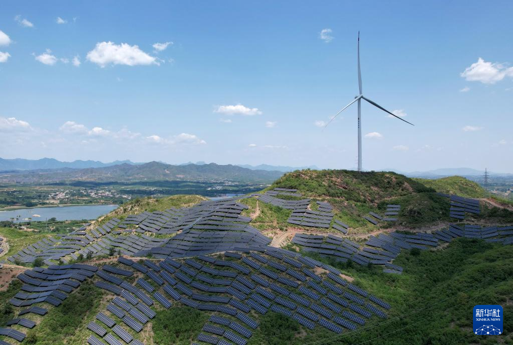 6月16日拍摄的河北省赞皇县院头镇曹家庄村附近的“风光互补”发电场(无人机照片)。