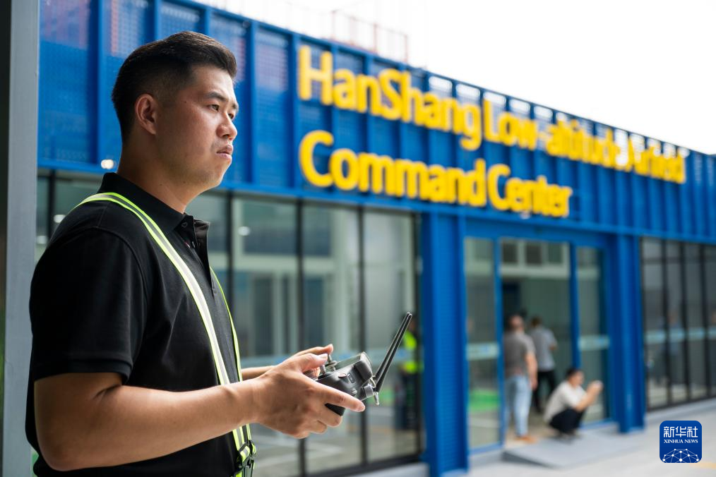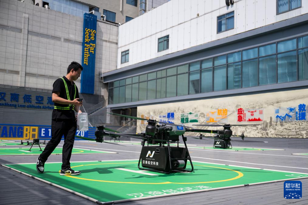 6月16日,在汉商低空港停机坪,一名工作人员在操控无人机起飞。