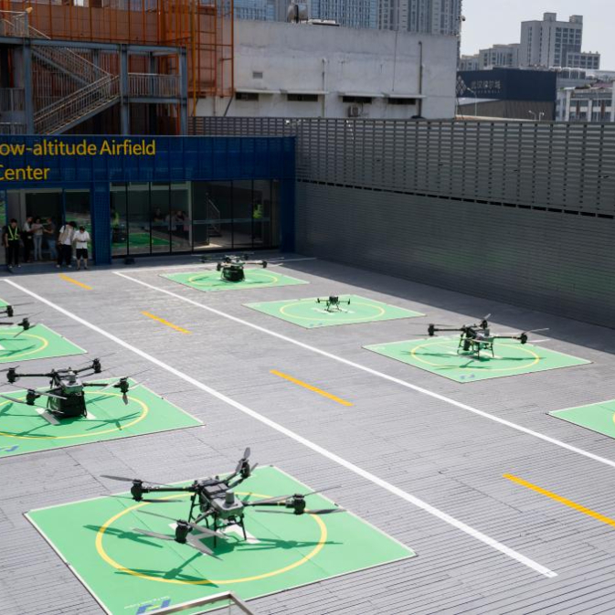 6月16日,几架无人机从汉商低空港停机坪起飞。