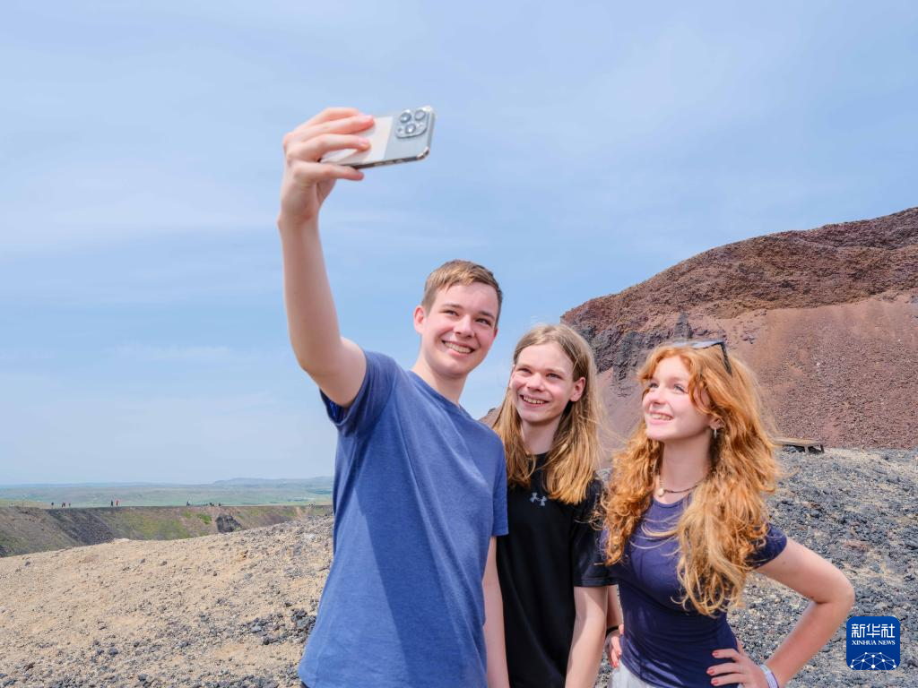 6月17日,三名美国游客在乌兰哈达火山地质公园6号火山合影。