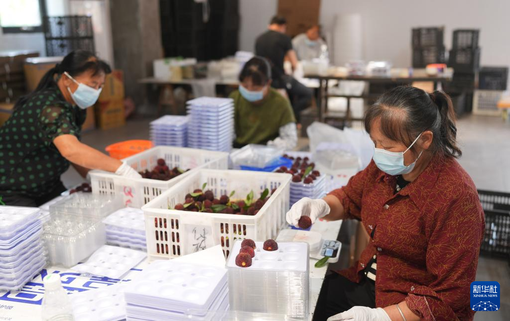 6月17日,在黄岩澄江街道的共富工坊,农户将新鲜采摘的东魁杨梅过秤分装。