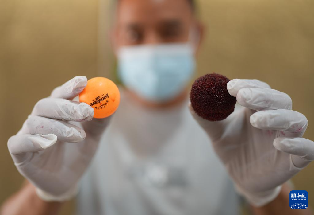 6月17日,在黄岩澄江街道的共富工坊,工作人员展示东魁杨梅和乒乓球的大小对比。